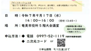 【ゲートキーパー養成講座】『ゲートキーパー』とは、悩んでいる人に気づき、声をかけ、話を聞いて、必要な相談先につなげるといった適切な関わりができる人のことです「気づきの視点」 や「声かけ方法」や 「話の聴き方」などについて学びを深めませんか日時:9/17(水)14:00~16:00場所:奄美市役所5階会議室お申し込みは以下へのお電話かwebから:0997-52-1119(奄美市 健康増進課)